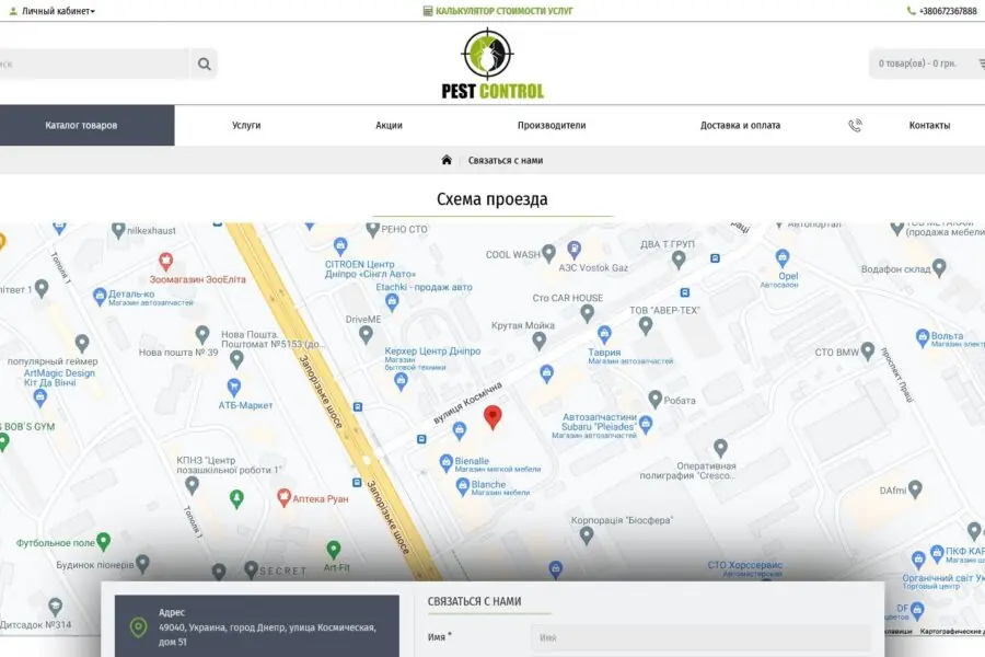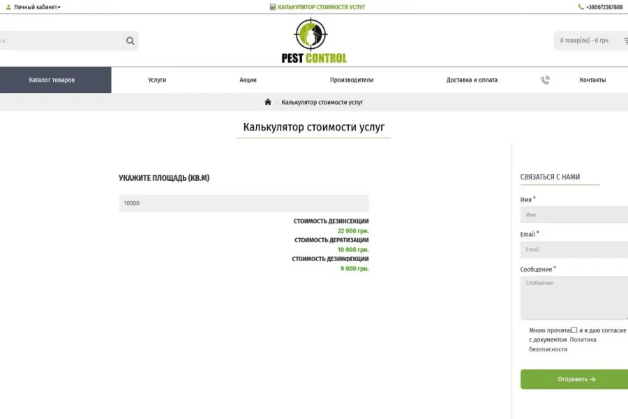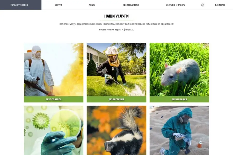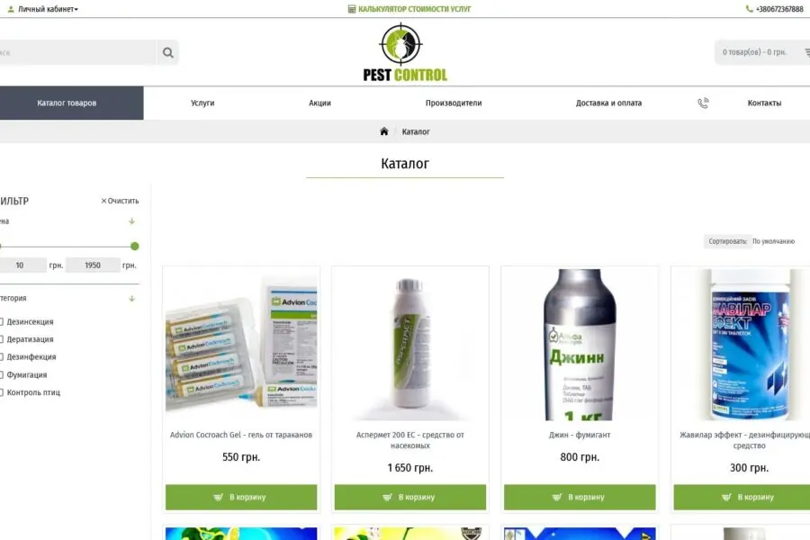 Online store for a company providing pest (insect) control services for large customers, such as agricultural holdings and farms.
